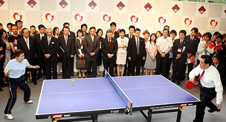 した胡主席は、五輪選手顔負けの強烈なスマッシュを